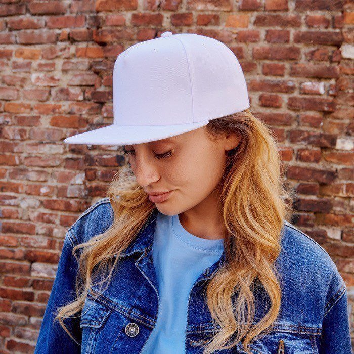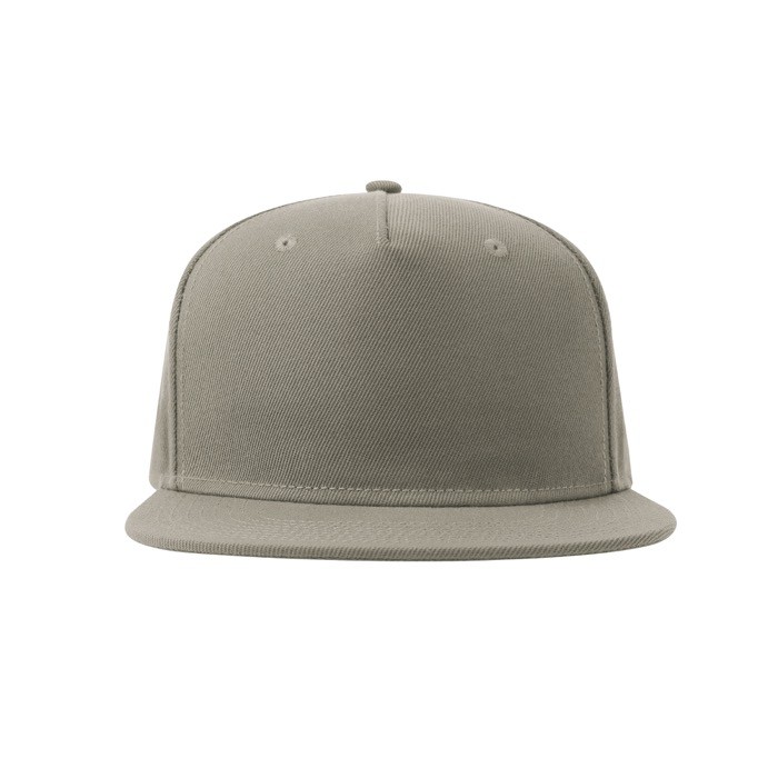 Vijf-panelen pet van keperstof van gerecycled polyester, met platte klep en snapback sluiting van gerecycled materiaal, typisch voor de streetwear-cultuur.