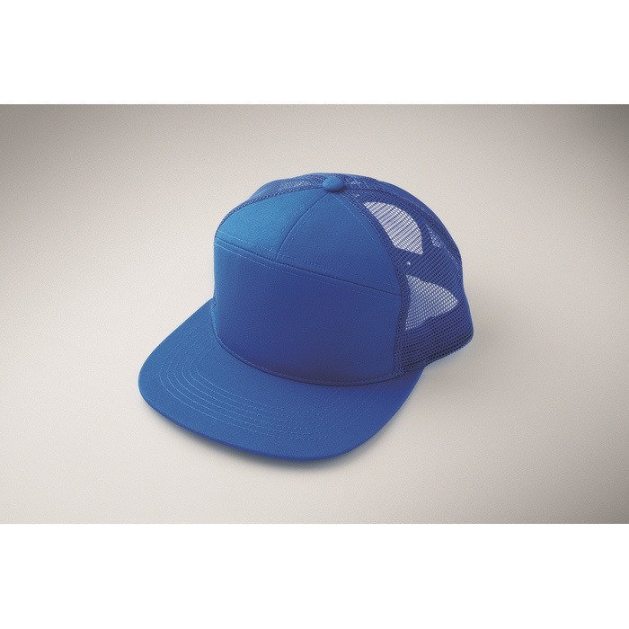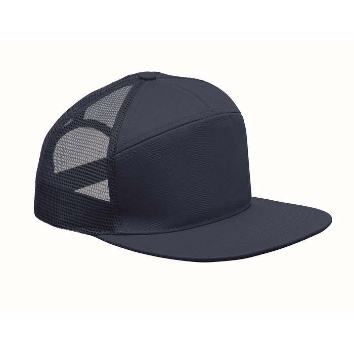 7-panelen pet van katoenen twill met platte klep en achterzijde van polyester mesh in rasterstijl. Combineert een gestructureerde voorkant voor goed zichtbare bedrukking met een ademende achterkant, ontworpen voor comfortabel gebruik tijdens lange dagen. Voorzien van een verstelbare kunststof sluiting om aan verschillende maten te passen en de uitgifte op events te vergemakkelijken. Praktische optie om teams uit te rusten, voor streetmarketingacties of corporate merchandising.