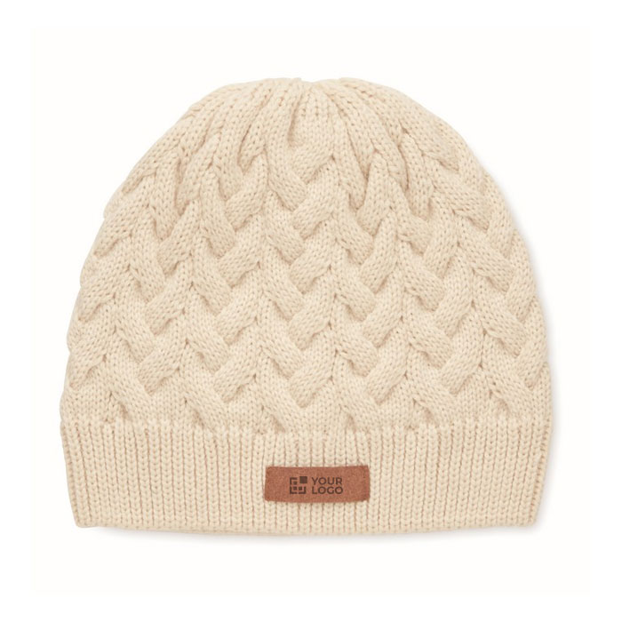 Deze heerlijk warme gebreide mutsen zijn gemaakt van ecologische RPET. Je kunt het etiket van de muts laten bedrukken met je logo. Keuze uit wit en zwart.