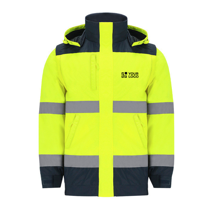 Unisex gewatteerde high-visibility jas met tweekleurig design, gemaakt van waterdichte buitenstof en thermisch gesealde naden om je te helpen beschermen tegen wind en regen. Er zitten twee horizontale reflecterende banden op het lichaam en twee op de mouwen voor betere zichtbaarheid bij weinig licht. Met oprolbare capuchon, rits aan de voorkant met klittenbandflap, verstelbare manchetten en elastische taille. Inclusief ritszakken en een interne opening aan de achterkant voor bedrukking met logo. Geschikt voor werkkleding, evenementen en merkacties.