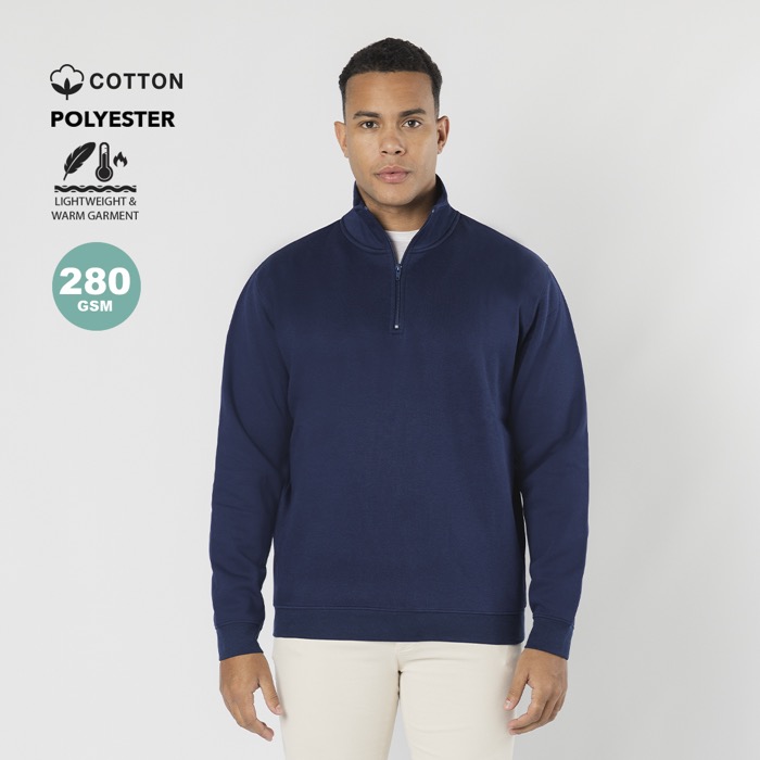 Unisex sweater van een mix van katoen en polyester, gemaakt van zachte geborstelde sweatstof van 280 g/m² voor comfortabel dagelijks gebruik. Hij heeft een halve rits in bijpassende kleur met trekker en een dubbel gevoerde hoge kraag. Zo blijf je lekker warm en ziet het er netter uit. Boorden en tailleband in 1x1 rib met elastaan helpen de pasvorm lang mooi te houden. Met zijnaden voor een gelijkmatigere valling. Geschikt voor werkkleding, beurzen en merkacties met logo.