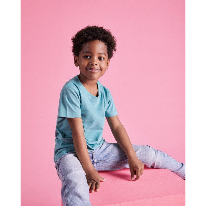 T-shirt met korte mouwen. Dubbele ronde kraag met elastaan. Vervaardigd in buisvormig weefsel in volwassenenmaten en met zijnaden in kindermaten. Met versterkte naadafdekkingen in kraag.
