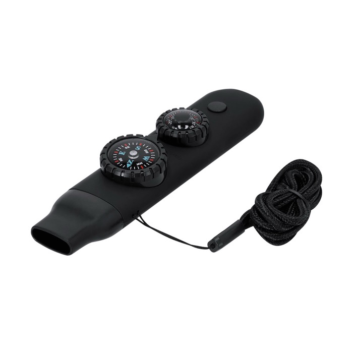 Overlevingsfluit van kunststof met rubberachtige afwerking, bedoeld om altijd bij de hand te hebben tijdens uitstapjes en buitenactiviteiten. Hij combineert een kompas, een krachtige fluit, een thermometer van -20ºC tot 50ºC, een loep, een spiegel en een lampje met 2 leds en een aan/uit-knop. Inclusief koord om hem om je nek te hangen en makkelijk mee te nemen. Een praktische optie voor bedrijfsacties rond veiligheid, outdoor evenementen of interne trainingen.