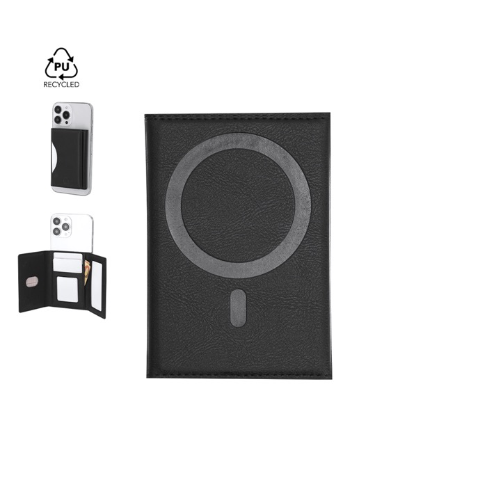 Kaarthouder met houderfunctie van gerecycled synthetisch leer. Het formaat is gemaakt voor elke dag op kantoor en voor klantbezoeken. Je krijgt een multifunctionele kaarthouder met 6 vakken. Zo orden je pasjes, badges of kleine notities zonder ruimte te verliezen. De magnetische vouwsluiting houdt alles beschermd en snel toegankelijk. Er zit een mobiel magnetisch bevestigingssysteem bij. Zo zet je hem snel vast en haal je hem er weer af wanneer nodig. Een praktische optie voor HR-acties, beurzen en als relatiegeschenk.
