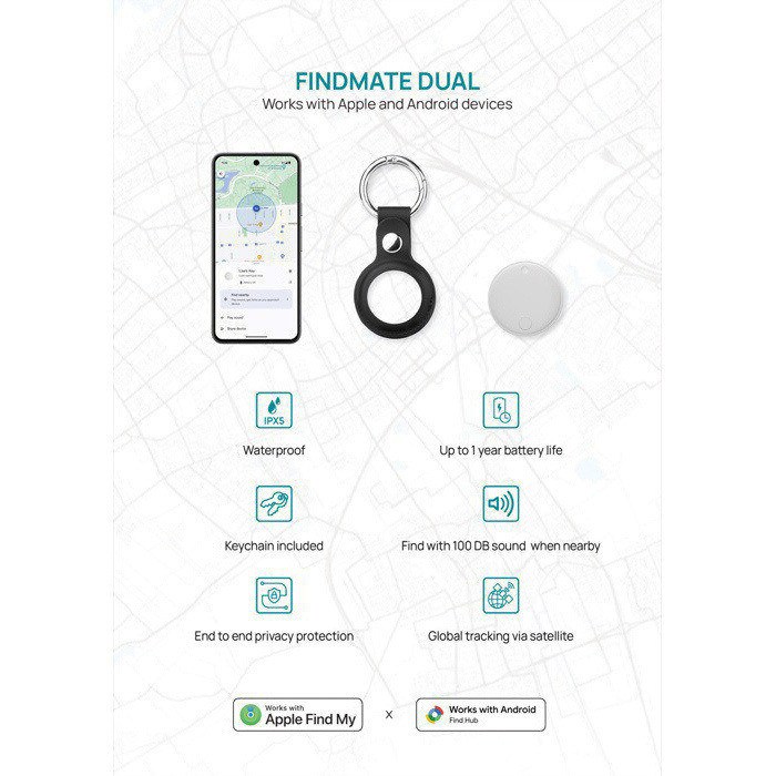 Vind alles, ongeacht welke telefoon je gebruikt! Findmate Dual is een hoogwaardige itemzoeker van gerecycled ABS die naadloos werkt met zowel Apple's Find My-netwerk als Android's Find My-netwerk. Dankzij de end-to-end encryptie van Apple en Google zijn je locatiegegevens veilig, zodat je je favoriete items in realtime kunt volgen, waar ter wereld je ook bent. Bevestig hem aan je portemonnee, sleutels, tas, bagage of zelfs je huisdier en lokaliseer hem direct met de Apple Find My-app of een ander Android Find My-compatibel apparaat. Uitgerust met een extra luid alarm van 100 dB en een geïntegreerde luidspreker voor piepsignalen, maakt Findmate Dual het vinden van items op korte afstand moeiteloos. De IPX5-waterdichtheid beschermt tegen spatwater en regen, terwijl de luxe PU-sleutelhanger zowel duurzaamheid als stijl garandeert. Activeer de verloren modus om meldingen te ontvangen wanneer je je spullen achterlaat en geniet van een batterijduur tot wel een jaar (vervangbaar CR2032). Gema