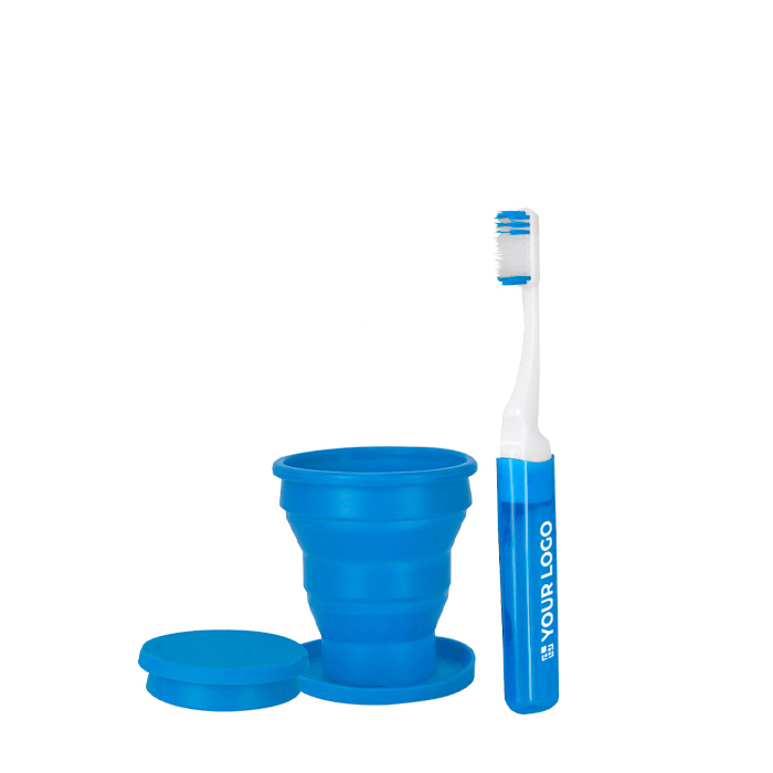 Set met tandenborstel en opvouwbare beker, bedoeld om ruimte te besparen onderweg. Tandenborstel van plastic (PP, polypropyleen) met opvouwbaar ontwerp, zodat je hem compact en hygiënischer kunt opbergen. Opvouwbare siliconen beker met een inhoud van 200 ml, klaar om te spoelen of om af en toe water mee te nemen. Geleverd in een transparant plastic zakje (PVC, polyvinylchloride) met zip-sluiting. Dat maakt meenemen makkelijk en houdt de onderdelen bij elkaar. Handig als relatiegeschenk voor reizen, evenementen en welkomstacties.
