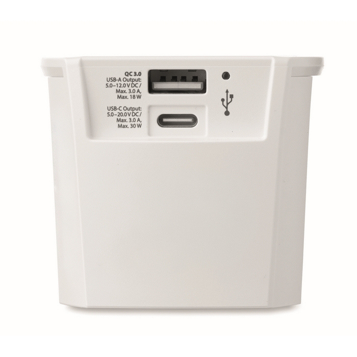 2-polige reisadapter met USB-A- en USB-C-poorten, ontworpen om apparaten in verschillende landen op te laden in een compact formaat. Biedt tot 30 W via USB-C en 18 W via USB-A voor snel en veilig laden, handig voor smartphones, tablets en werkaccessoires. Het universele ontwerp maakt gebruik onderweg eenvoudiger en vermindert de noodzaak om meerdere opladers mee te nemen. Praktische optie voor welkomstpakketten, internationale evenementen of reisuitrusting voor salesteams.