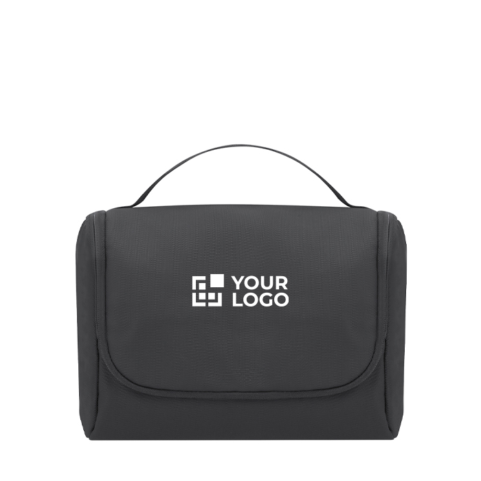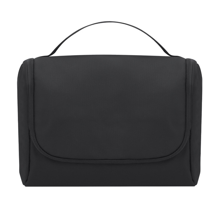 Toilettas van synthetisch leer om persoonlijke verzorgingsspullen netjes op te bergen tijdens reizen of onderweg. Met een praktische haak om hem overal op te hangen. Handig in badkamers met weinig ruimte of als je alles binnen handbereik wilt hebben. Binnenin zitten ademende gaasvakjes. Zo zie je de inhoud in één oogopslag en houd je kleine items gescheiden zonder dat alles door elkaar raakt. Een handige optie voor welkomstacties, bedrijfsevenementen of kantoormerchandising.