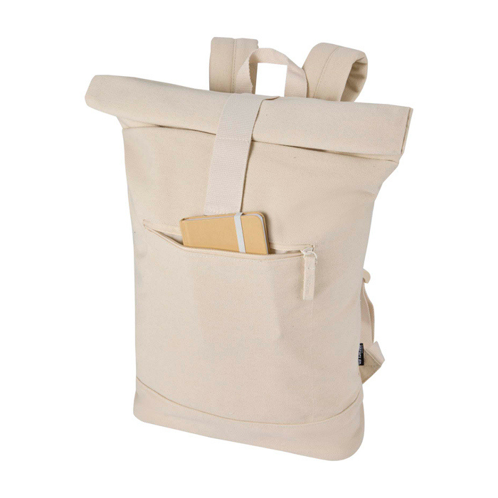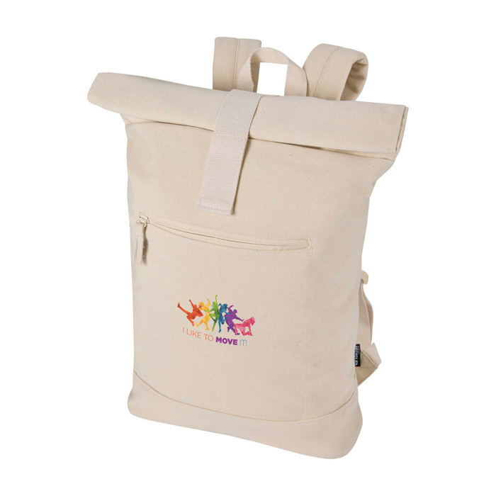 Waterafstotende rugzak van gerecycled canvas met bijpassende voering van gerecycled plastic, ontworpen voor veelzijdig dagelijks gebruik. Hij heeft een gevoerd laptopvak voor laptops tot 14”, een voorvak met rits en een ademend achterpaneel van mesh dat helpt om hem comfortabeler te dragen. Met de rolltopsluiting aan de bovenkant vergroot je de ruimte wanneer je meer wilt meenemen, terwijl de inhoud beschermd en goed bereikbaar blijft. Een praktische keuze voor woon-werkverkeer, zakenreizen en merkactivaties op bedrijfsevenementen.