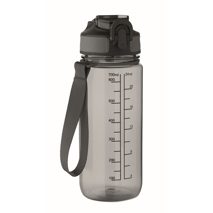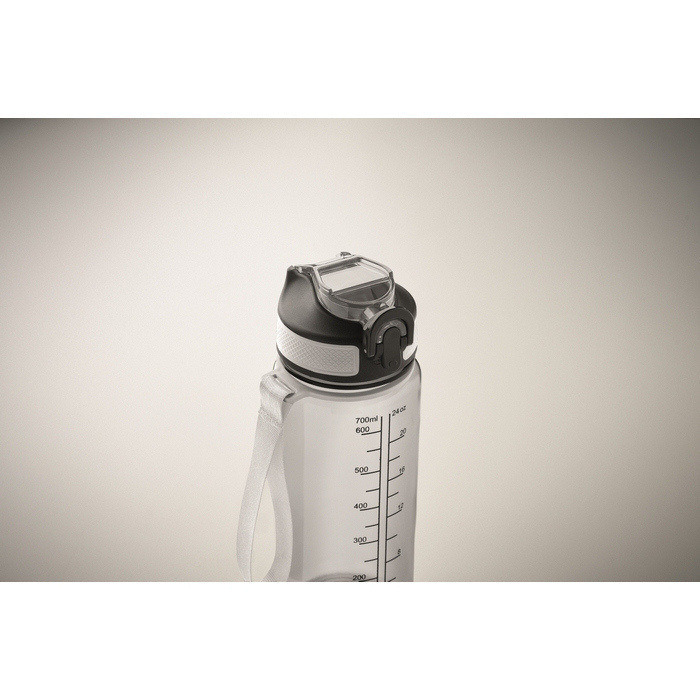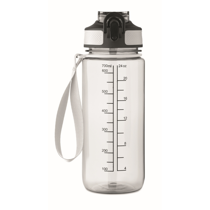 Sportfles van RPET met een inhoud van 700 ml, geschikt voor dagelijks gebruik op kantoor, bij evenementen of buitenactiviteiten. Voorzien van geïntegreerd rietje en zachte siliconen drinktuit voor comfortabel drinken. Het klapdeksel opent met één hand en de veiligheidsvergrendeling voorkomt ongewenst openen. Inclusief RPET-draaglus en lekvrij ontwerp. Praktische optie voor welkomstpakketten, interne acties of promotiecampagnes.