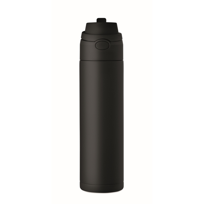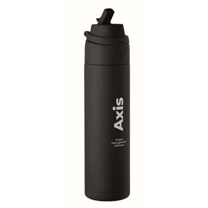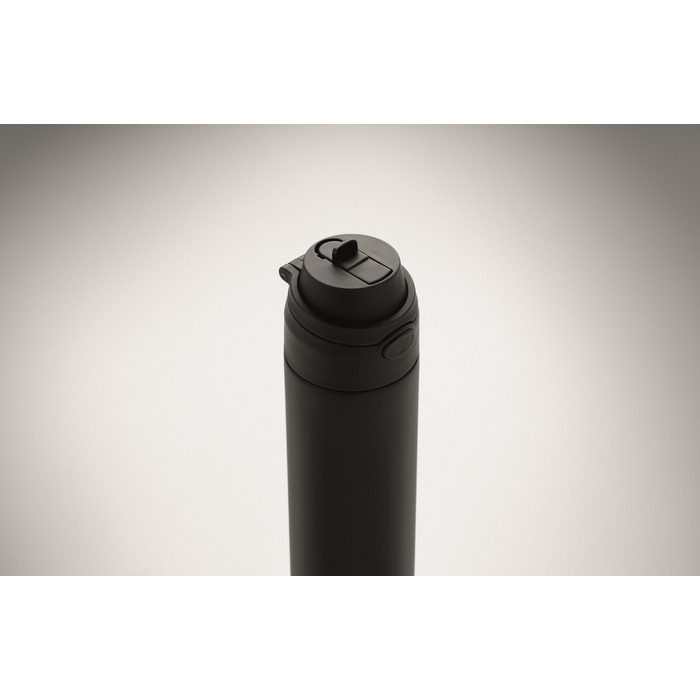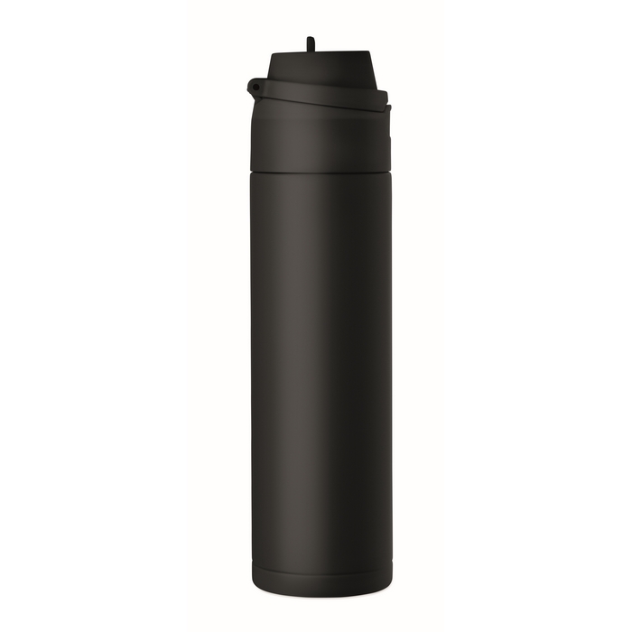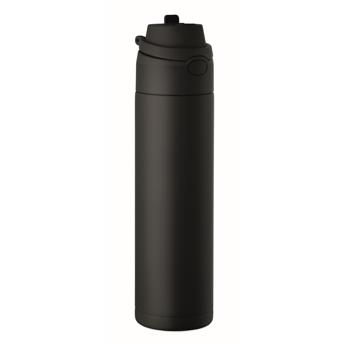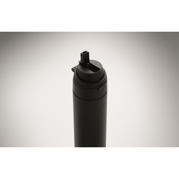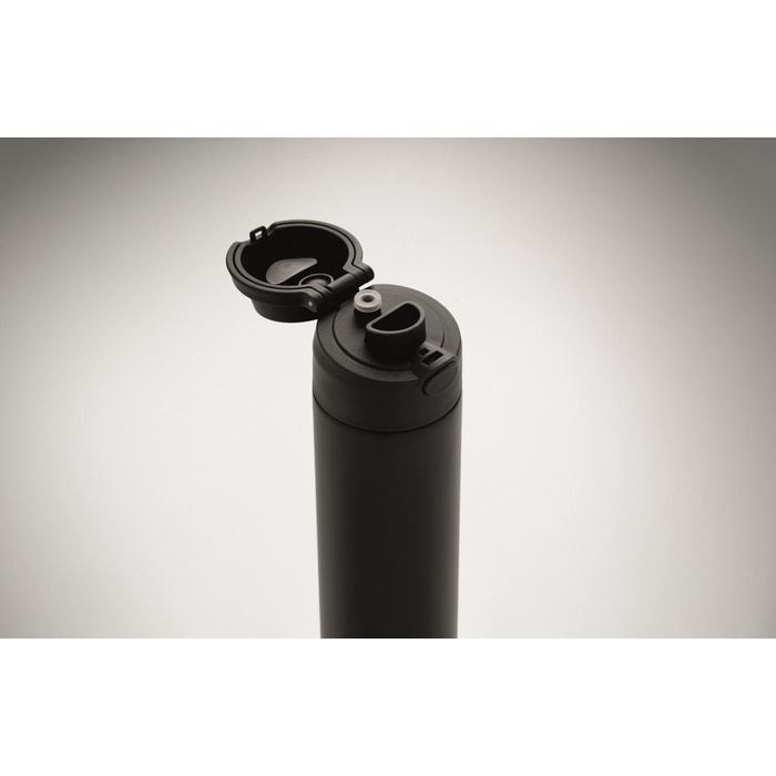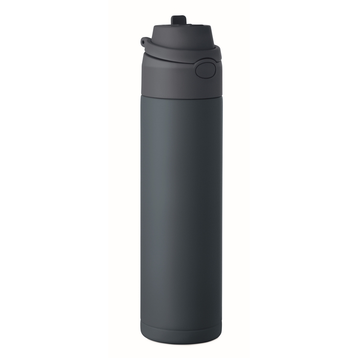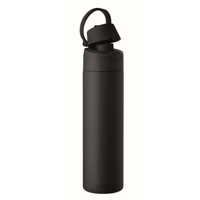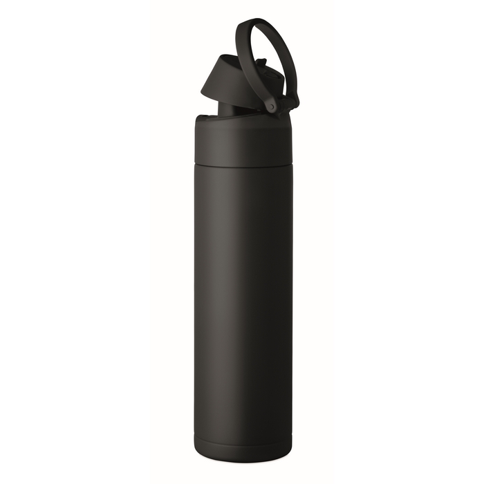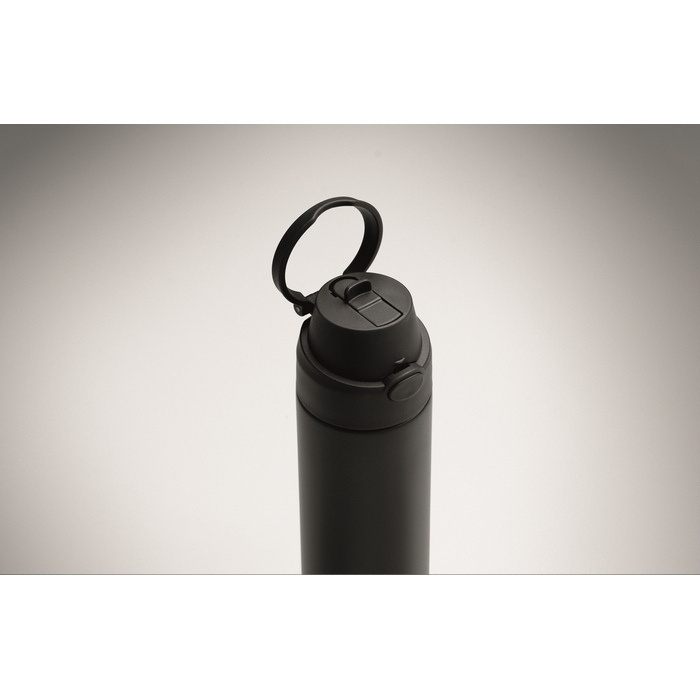 Dubbelwandige fles van gerecycled roestvrij staal (90% gerecycled en 10% roestvrij staal) met een inhoud van 500 ml. Voorzien van een PP-dop met draaglus voor eenvoudig transport en een 2-in-1-rietje dat het gebruik op kantoor, in de auto of tijdens evenementen vereenvoudigt. De sluiting is lekvrij en met een druppelvrij systeem, ontworpen om morsen in tassen of rugzakken te voorkomen. Praktische oplossing voor het samenstellen van welkomstkits, loyaliteitsacties of corporate merchandising.