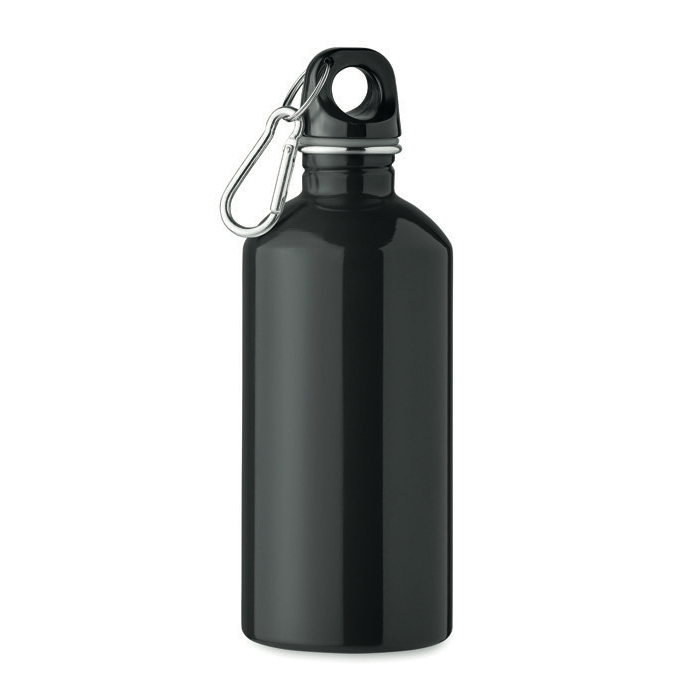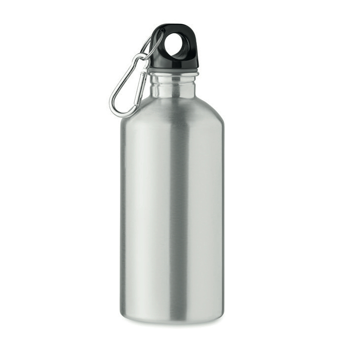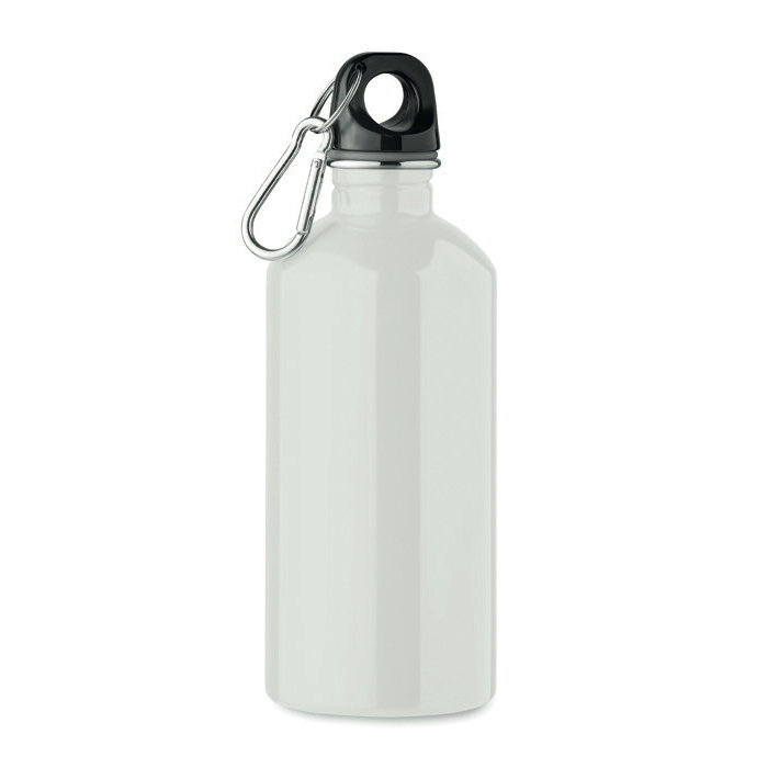 Enkelwandige fles van gerecycled roestvrij staal (90% gerecycled en 10% roestvrij staal) met een inhoud van 500 ml en een karabijnhaak om aan rugzakken of tassen te hangen. Lek- en druppelvrij ontwerp om morsen tijdens verplaatsingen en dagelijks gebruik te voorkomen. Sublimatiedruk (full-colour markering via thermische overdracht) is alleen beschikbaar op het witte model. Omdat het een enkelwandige fles is, kan de warmte van de drank naar buiten worden doorgegeven. Praktische optie voor welkomstpakketten, evenementen en merkacties.