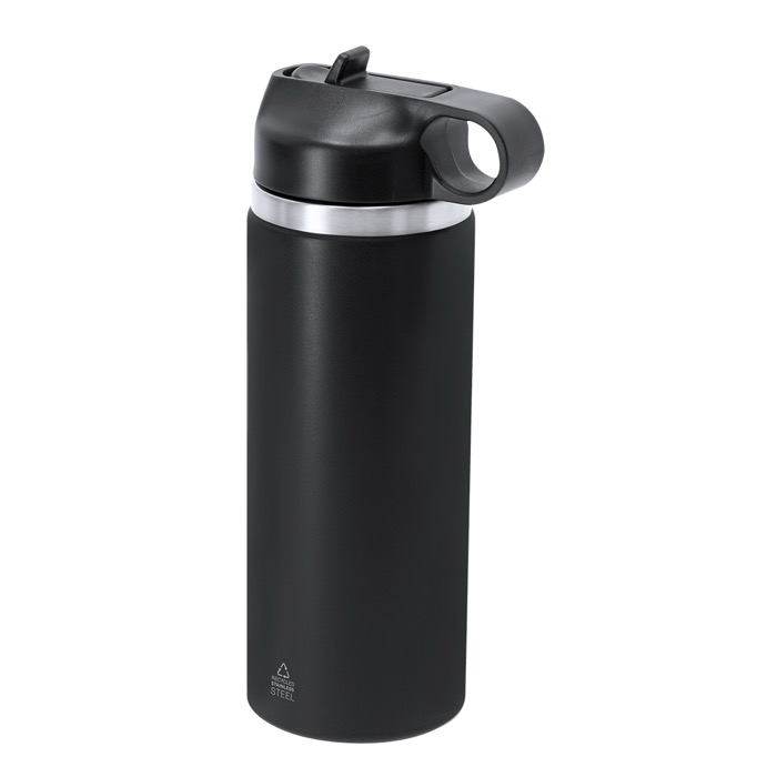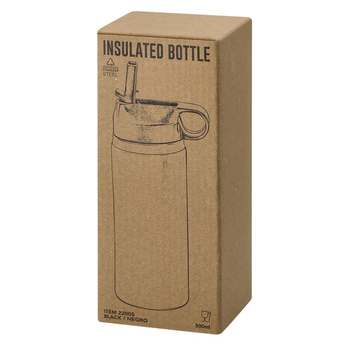 500 ml bidon van gerecycled roestvrij staal met dubbele wand, BPA-vrij rietje en draaghandvat. Kies voor dit duurzaam alternatief en houdt dranken langer op temperatuur, en toon je merk in stijl!