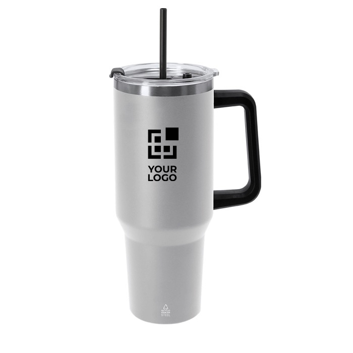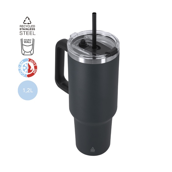Thermoskan met een capaciteit van 1,2 L. Gemaakt van gerecycled roestvrij staal. Voorzien van een dubbel drinksysteem: tuit met hermetische sluiting en geïntegreerd rietje, aangepast aan de gebruiksvoorkeuren. Inclusief ergonomisch PP-handvat voor extra comfort. BPA-vrij. Met embleem van gerecycled roestvrij staal. Staal is een van de meest gevraagde materialen en is vrijwel overal te vinden, van alledaagse producten tot grote constructies. Met talloze eigenschappen, waarvan duurzaamheid en een hoge mate van herbruikbaarheid de belangrijkste zijn, is het een zeer gewaardeerd alternatief in duurzaamheidsoplossingen. Bij correcte verwerking maakt het de creatie van nieuwe, eindeloos bruikbare grondstoffen mogelijk.