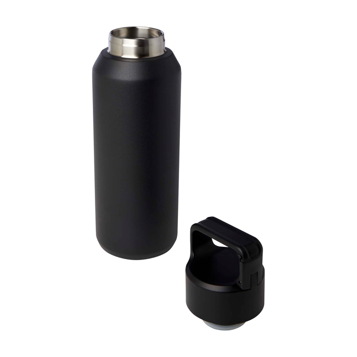 RCS-gecertificeerde roestvrijstalen dubbelwandige koperen vacuüm geïsoleerde waterfles met een dop met ingebouwde karabijnhaak, waardoor je de fles eenvoudig aan een tas of riem kunt bevestigen. Ook geschikt voor koolzuurhoudende dranken. Gepresenteerd in een gerecyclede kartonnen geschenkverpakking. Inhoud: 600 ml.