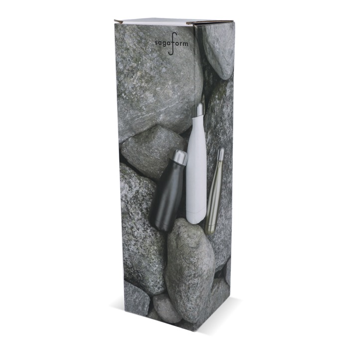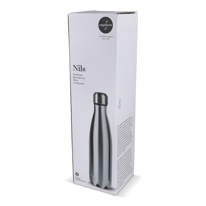 De Sagaform Nils stalen fles in chroom is een elegante thermosfles van gerecycled staal met een exclusieve glanzende afwerking. Dankzij de dubbele wanden en koperen coating blijft je drankje tot 24 uur koud of 12 uur warm, zonder condensatie. Perfect geschikt voor lasergravure. Handwas aanbevolen. Geleverd in een geschenkdoos.