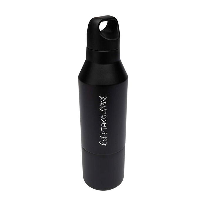 RCS-gecertificeerde, roestvrijstalen, dubbelwandige, geïsoleerde fles met koperisolatie en een afneembare beker. Deze multifunctionele fles is ontworpen om in het zijvak van een rugzak te passen en heeft een handig handgreep dat in de dop is geïntegreerd. Duurzame powercoating aan de buitenkant. Houdt dranken 12 uur warm of 24 uur koud. Gepresenteerd in een gerecyclede kartonnen geschenkverpakking. Inhoud fles: 600 ml. Inhoud beker: 300 ml.