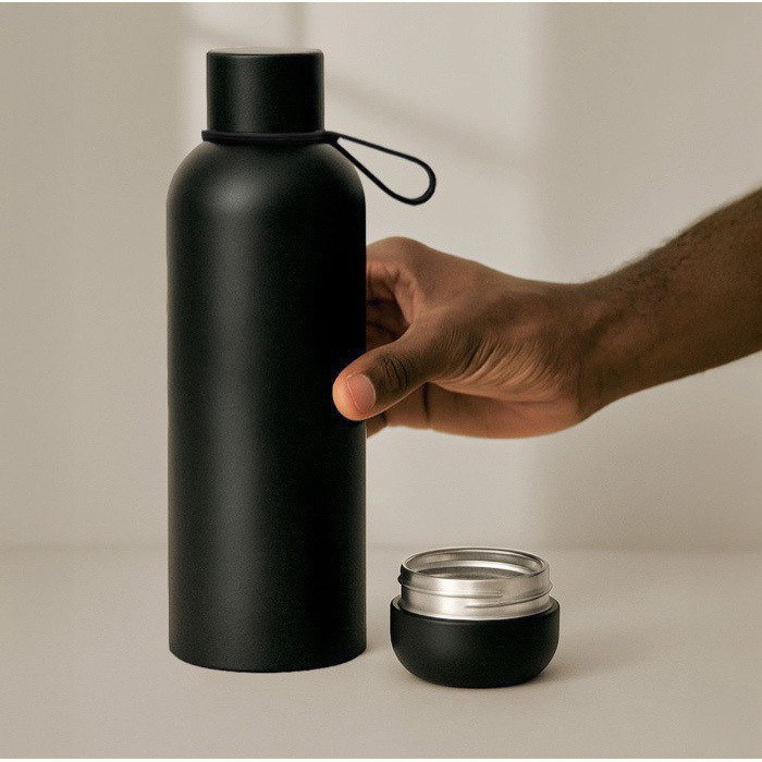 Thermosfles 430 ml van roestvrij staal met dubbele wanden en geïntegreerd glas in de bodem. Houdt dranken warm of koud.