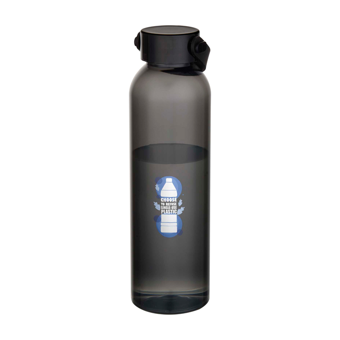 Waterfles van RCS-gecertificeerd RPET, met handige siliconen handgreep. In overeenstemming met het door de EFSA goedgekeurde PET-recyclingproces. Inhoud: 630 ml.