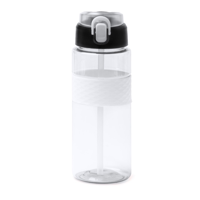 Sportfles van gerecycled plastic van 700ml in bidonvorm, bedoeld voor dagelijks gebruik op kantoor, bij events en onderweg. Hij heeft een doseerdop met siliconen rietje en een dop die automatisch opent via een knop aan de voorkant, zodat je kunt drinken zonder los te draaien. De dop heeft een veiligheidssysteem om ongewenst openen te voorkomen. Met draaglus en een siliconen band met structuur op de fles, voor extra grip, ook met een natte hand. Een praktische optie om te bedrukken met logo voor interne acties of promoties.