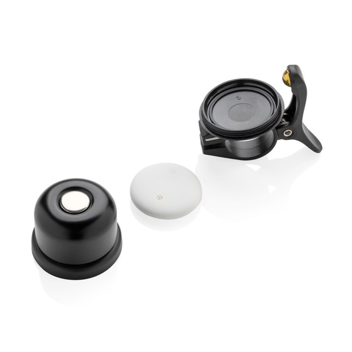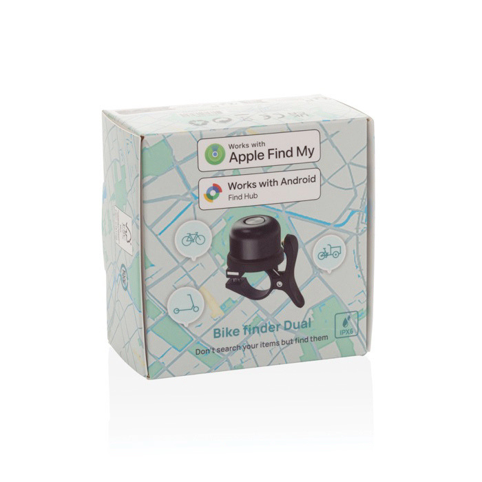 Fietsbeld met tracker en ingebouwde volgtechnologie. Zo houd je in het dagelijks gebruik in de gaten waar je fiets is. Compatibel met Zoek mijn van Apple en met Find Hub van Android. Je krijgt meldingen als je ’m achterlaat en je bekijkt de locatie via compatibele netwerken. Ben je in de buurt, dan kun je een geluid afspelen om de locatie nauwkeuriger te bepalen. Met IPX5-bescherming voor gebruik in regen en een batterij met lange levensduur, tot 12 maanden voordat je hem vervangt. Handig voor loyaliteitsacties, events en campagnes rond stedelijke mobiliteit met jouw logo.