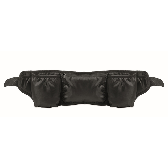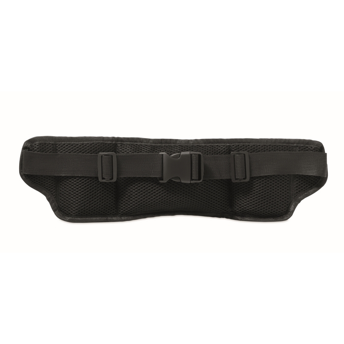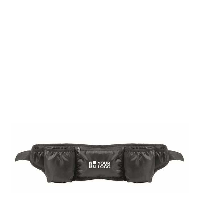Heuptas van 420D RPET-polyester met een mesh achterkant, ontworpen voor hardlopen en wandelen. Voorzien van twee zijvakken voor flessen en een centraal vak met rits om sleutels, telefoon of documenten georganiseerd mee te nemen. De verstelbare riem helpt de tas rond de taille te fixeren en de inhoud stabiel te houden tijdens beweging. Lichtgewicht en duurzame constructie voor langdurig buitengebruik. Praktische optie voor sportevent-uitrustingen, clubs of merkacties.