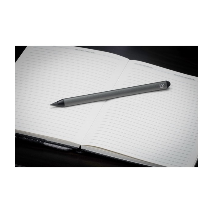 2-in-1 pen van gerecycled aluminium met geïntegreerde touchscreenpen, bedoeld voor dagelijks gebruik zonder navullingen. De slijtvaste grafietpunt schrijft tot 2000 m zonder inkt. Zo heb je minder onderbrekingen en hoef je minder te vervangen, op kantoor of onderweg. De machinaal bewerkte aluminium behuizing ligt stevig in de hand en oogt verzorgd, ideaal voor professionele omgevingen. Wordt geleverd in een bruin doosje en per stuk verpakt, voor een nette uitgifte bij merkacties, beurzen of bedrijfsevents.
