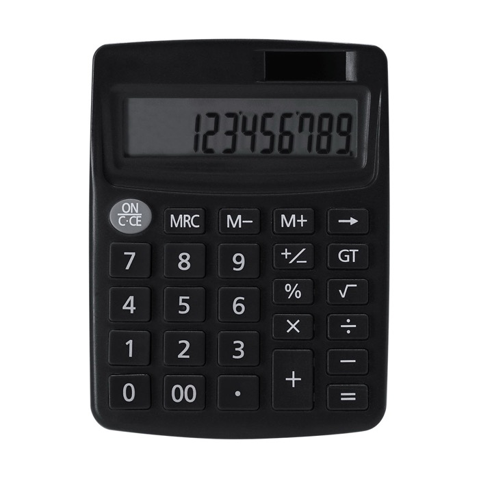 Bureaurekenmachine van stevig kunststof met soft-touch toetsen, gemaakt voor comfortabel dagelijks gebruik op kantoor of bij de receptie. Toont 12 cijfers op een Liquid Crystal Display (LCD) voor duidelijke aflezing. Werkt dubbel: op zonne-energie en met extra voeding via de meegeleverde knoopcelbatterij, zodat hij niet stopt als het licht afneemt. De automatische uitschakeling helpt het verbruik te beheren. Handig voor HR-acties, beurzen of als bedrijfsdetail met jouw logo.