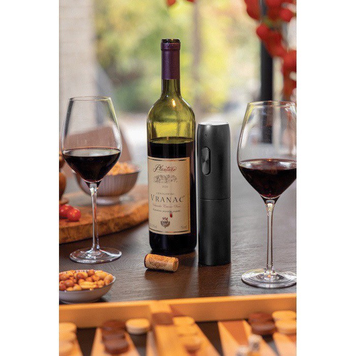 Oplaadbare elektrische wijnopener in matzwarte afwerking. Ontworpen om flessen snel en zonder gedoe te openen. Met een 500mAh lithium-ionbatterij waarmee je 20 tot 30 flessen per lading opent. Volledig opladen duurt ongeveer 3 uur. Inclusief USB-A-naar-USB-C (Universal Serial Bus)-kabel van 30cm en eenvoudige bediening met een knop voor omhoog en omlaag, plus een indicatielampje. Geleverd in een plasticvrije etui met FSC-certificering voor verantwoord bosbeheer. Handig als relatiegeschenk en voor merkacties op kantoor of tijdens events.