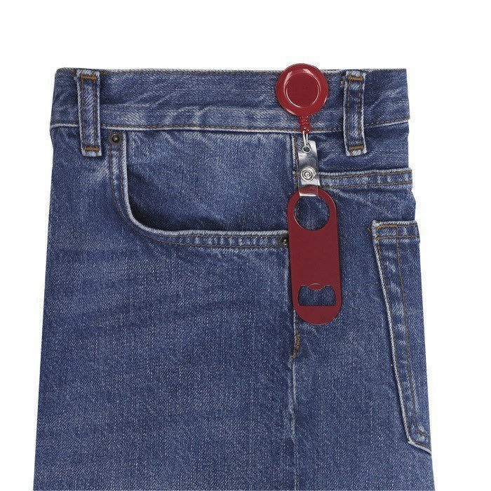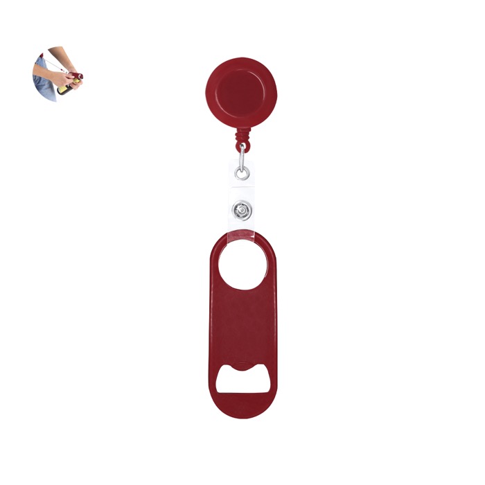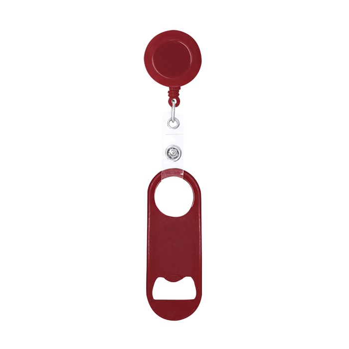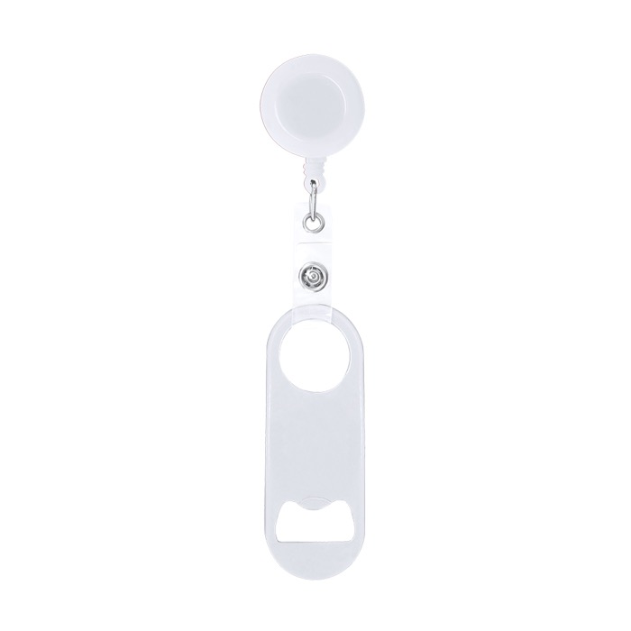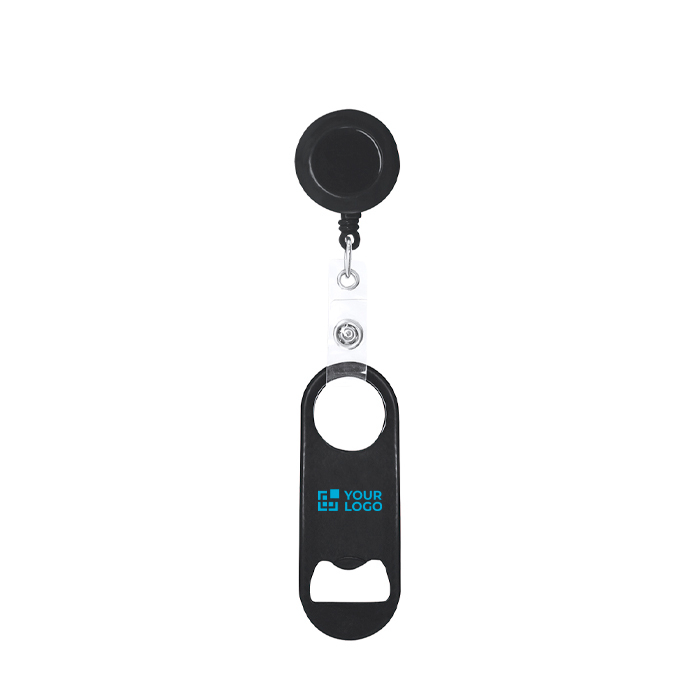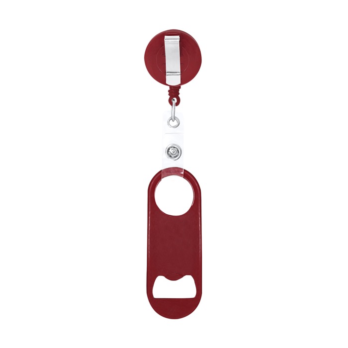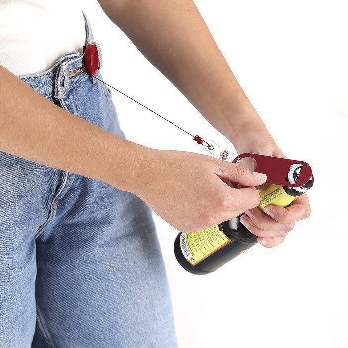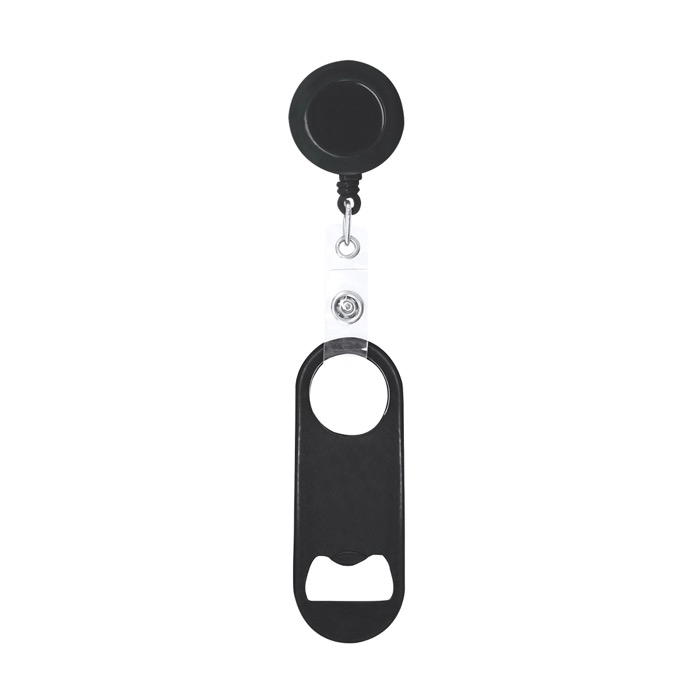 Stalen opener met glanzende metalen afwerking, ontworpen voor dagelijks gebruik bij events en in de horeca. Aan de ene kant zit een flessenopener en aan de andere kant een rond gat dat met een drukknoopsluiting vastzit aan een oprolbare houder van 65cm met clip. Je draagt hem vastgeklikt zodat je minder snel iets kwijtraakt en sneller werkt achter de bar of bij servicepunten. Dankzij de afneembare sluiting gebruik je alleen de opener of klik je hem apart aan een lanyard voor bedrijfsacties.