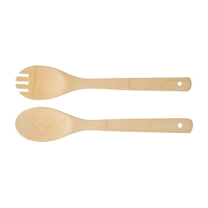 Bamboe saladebestek. Het bestek heeft gaatjes aan het uiteinde van het handvat. Verpakt in een katoenen trekkoordzakje.