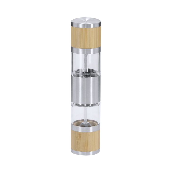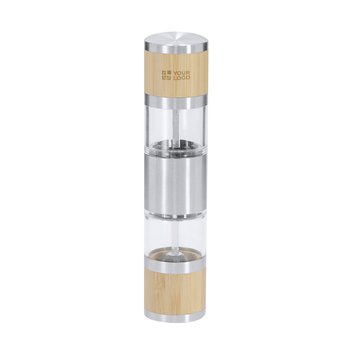 Handmatige molen voor zout en peper van bamboe en roestvrij staal, bedoeld voor dagelijks gebruik in de keuken of in de bediening. Hij heeft twee aparte compartimenten, één voor elke smaakmaker, zodat je makkelijk wisselt zonder twee verschillende molens te gebruiken. Elke kamer heeft een interne keramische maalwerk met handmatige instelling van de maalgraad. Zo kies je een fijne of grovere maling, afhankelijk van het gerecht. Dankzij het zijvenster zie je in één oogopslag het vulniveau. Een praktische optie voor zakelijke geschenken in de horeca of voor merkacties in de voedingssector.