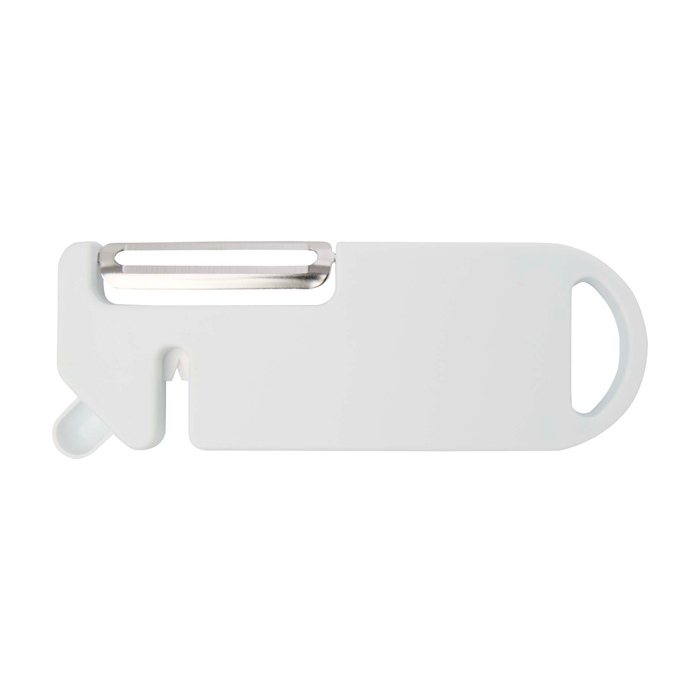 Dit multifunctionele keukengereedschap combineert vier essentiële functies in één compact ontwerp. Gemaakt van gerecycled plastic en voorzien van een dunschiller, flesopener, messenslijper en een puntig uiteinde voor het verwijderen van aardappelvlekjes. Een ingebouwd ophanggat maakt opbergen eenvoudig. Praktisch en ruimtebesparend, een veelzijdige must-have voor elke thuiskok.