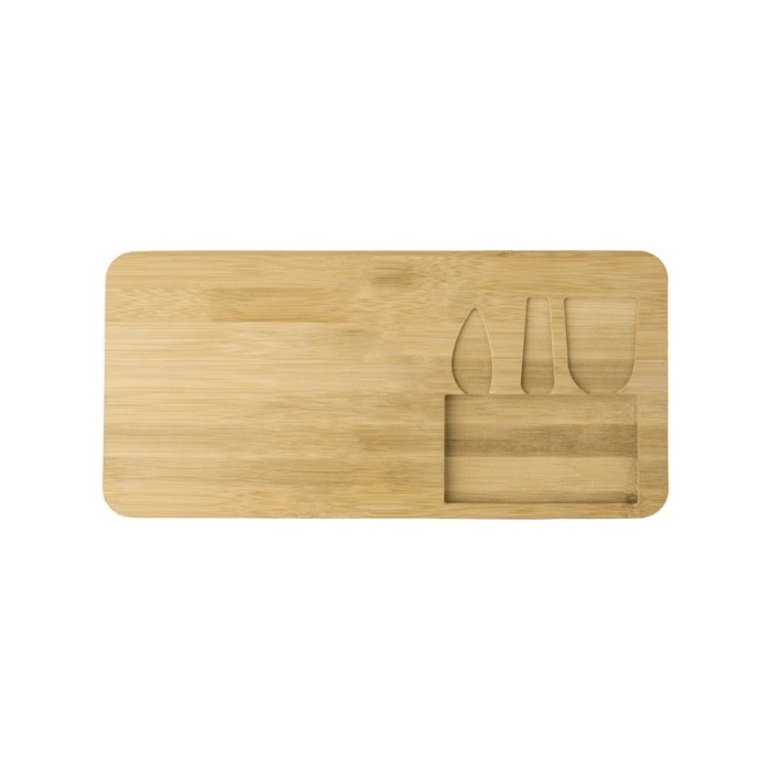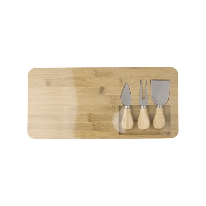 Bamboe kaasplank met drie messen die elk in uitsparingen in de plank passen. Individueel verpakt in kartonnen doos.
