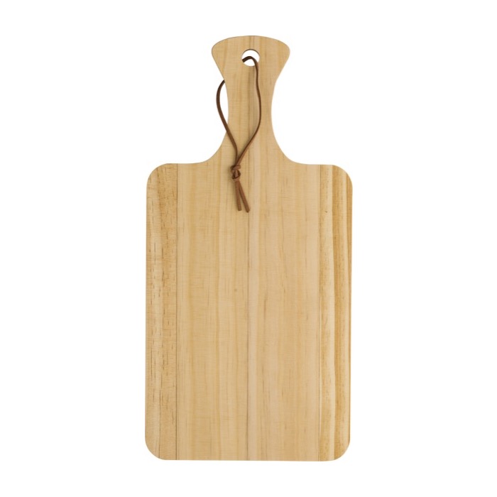 Grenenhouten snijplank met touw. Individueel gepresenteerd in een bruine kartonnen doos.