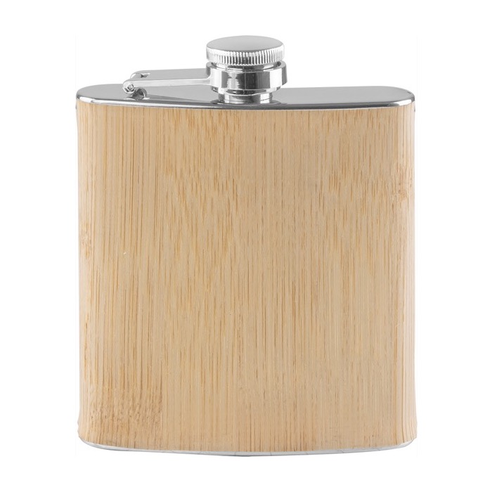 Stalen fles met bamboe finish. 160 ml inhoud en 4 mm brede wand. Origineel om weg te geven als promotieartikel.