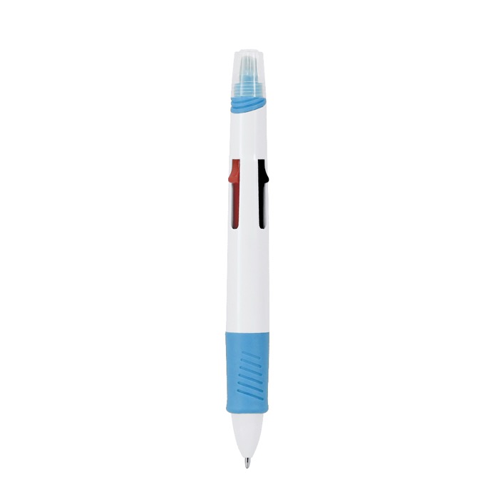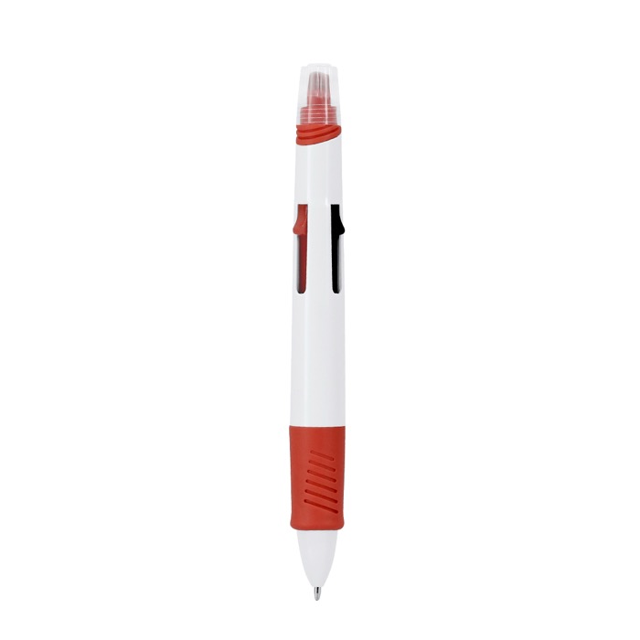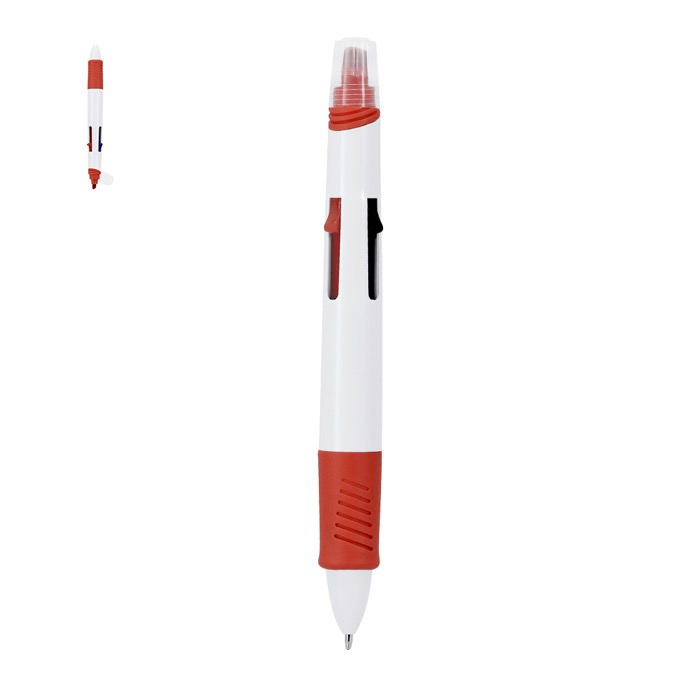 Plastic pen met geïntegreerde markeerstift, gemaakt om meerdere kleuren bij de hand te hebben zonder van hulpmiddel te wisselen. Je hebt 4 inkten in één behuizing, handig om notities te maken, te corrigeren en informatie per categorie te ordenen. Met de meegeleverde marker benadruk je zinnen en belangrijke gegevens, en dankzij de doorzichtige dop zie je de kleur in één oogopslag. Een praktische keuze voor HR-acties, beurzen en bedrijfsitems met bedrukking.