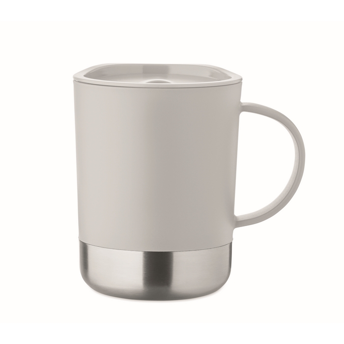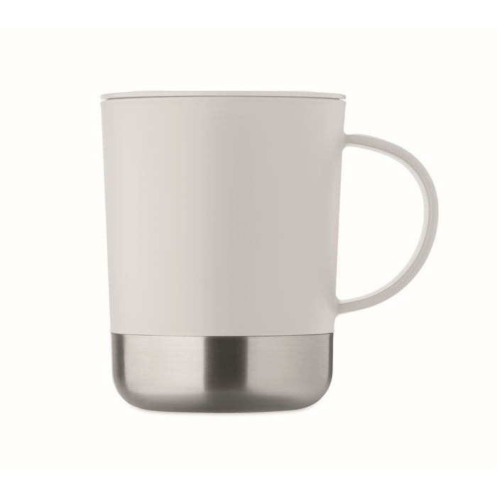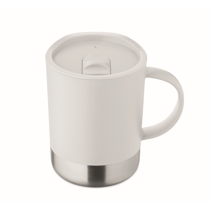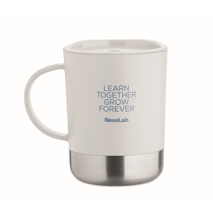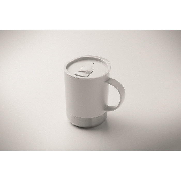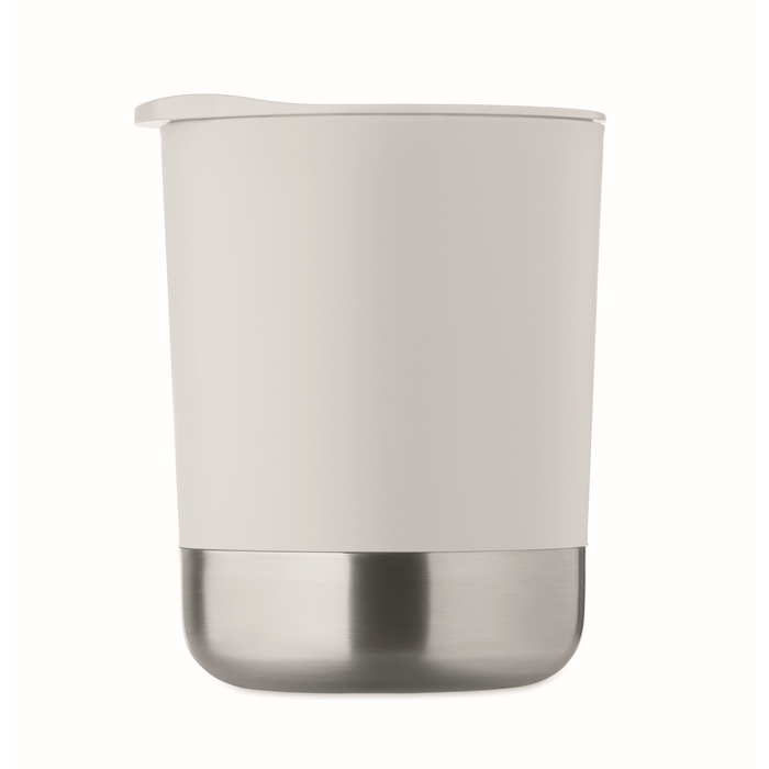 PP-beker met basis van gerecycled roestvrij staal (90% gerecycled roestvrij staal en 10% roestvrij staal) en schuifdeksel van PP, geschikt voor dagelijks gebruik op kantoor of onderweg. Inhoud van 300 ml, ideaal voor koffie, thee of koude dranken. De metalen basis biedt stabiliteit op bureaus en toonbanken, terwijl het schuifdeksel morsen vermindert. Handige optie als relatiegeschenk of voor merkacties.