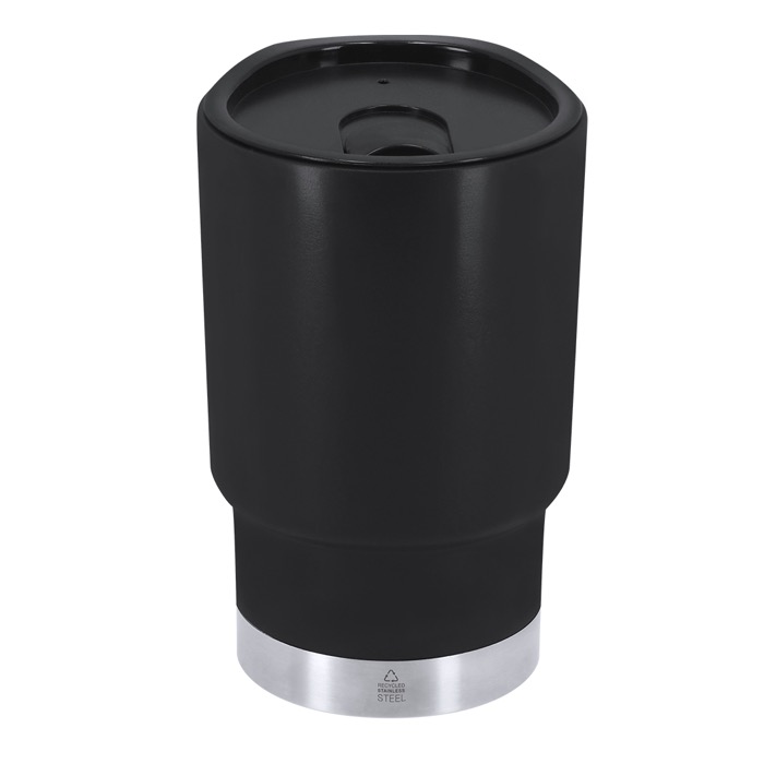 380 ml thermische beker. Gemaakt van stevig gerecycled PP met dubbele wand, gecombineerd met een basis van gerecycled roestvrij staal. Deksel met eenvoudig te openen dispenser, BPA-vrij. Ideaal voor je bureau, tafel of elke andere plek waar je rustig van je favoriete drankje wilt genieten. Met Food Grade-certificering, die veiligheid garandeert bij contact met voedsel. Met embleem van gerecycled roestvrij staal. Gerecycled PP is een gerecyclede en zeer goed recyclebare kunststof, zeer sterk en geschikt voor uiteenlopende toepassingen. Staal is een van de meest gevraagde materialen en is bijna overal te vinden, van alledaagse producten tot grote constructies. Met talloze eigenschappen, waaronder duurzaamheid en een hoog hergebruikniveau, is het een zeer gewaardeerd alternatief in duurzame oplossingen. Bij correcte behandeling levert het nieuwe middelen op voor oneindig gebruik.