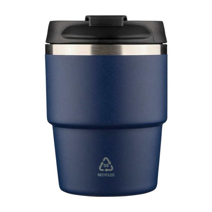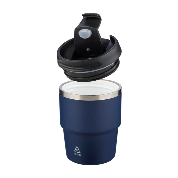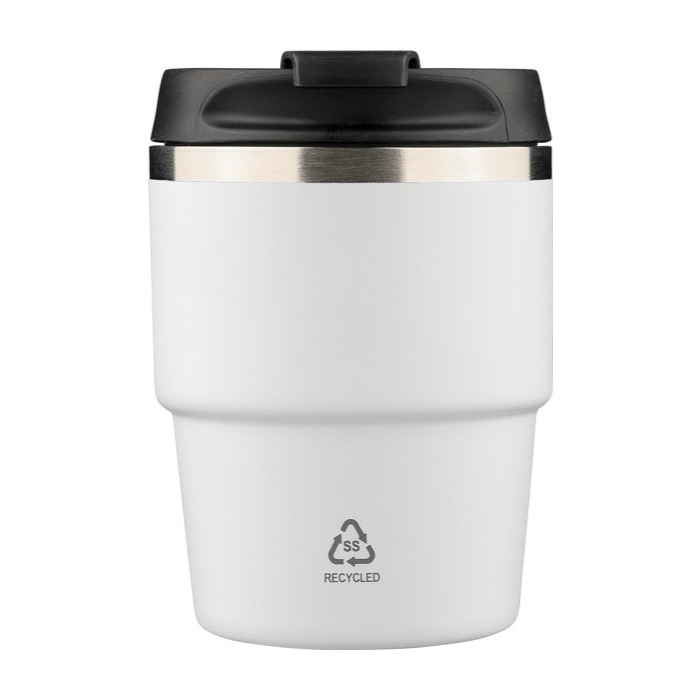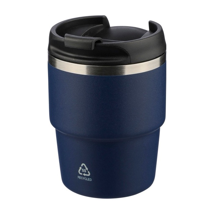 Beker van gerecycled roestvrij staal met dubbelwandige vacuümisolatie en een kunststof schroefdeksel voor een veilige sluiting. De binnenkant van roestvrij staal 304 helpt de drank langer op de juiste temperatuur te houden. De buitenkant van roestvrij staal 201 heeft een poedercoating voor extra grip. Het compacte formaat past in de meeste koffiemachines. Met een roestvrijstalen logo dat aan de voorkant met laser is gegraveerd. Wordt geleverd in een individuele bruine kartonnen doos, handig voor zakelijke acties.