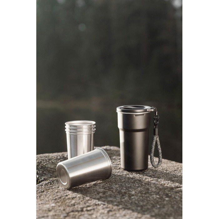 Reisbeker van 450ml met handgreep en een set stapelbare bekers van gerecycled roestvrij staal. Handig om drankjes te delen tijdens uitstapjes en onderweg. Inclusief vier bekers van 250ml die binnenin passen, zodat je een compact en makkelijk mee te nemen formaat hebt. De RCS-certificering (Recycled Claim Standard) bevestigt de traceerbaarheid van het gerecyclede materiaal in de toeleveringsketen; het product bevat 79% gecertificeerd gerecycled roestvrij staal. Niet geschikt voor vaatwasser of magnetron. Alleen met de hand afwassen. Handig voor outdoor events, bedrijfsreizen of teamacties voor je merk.