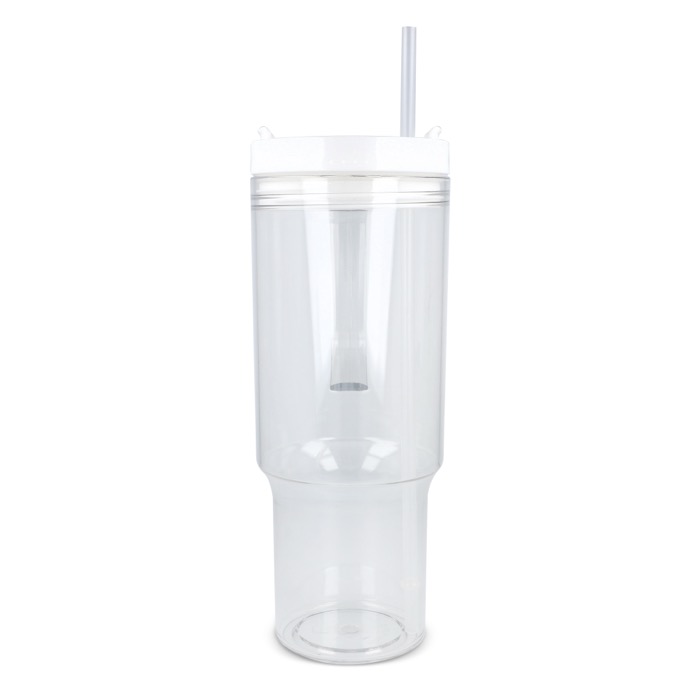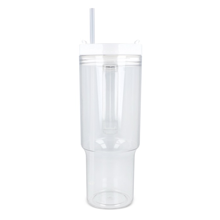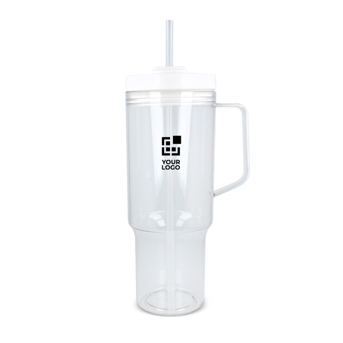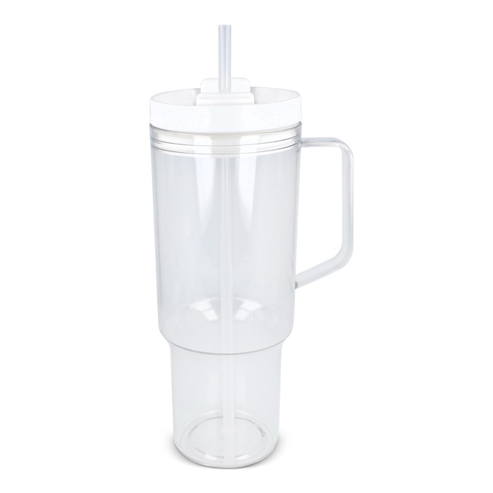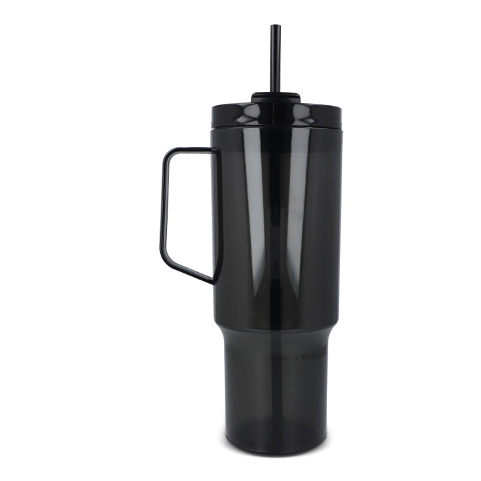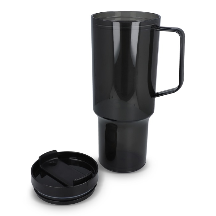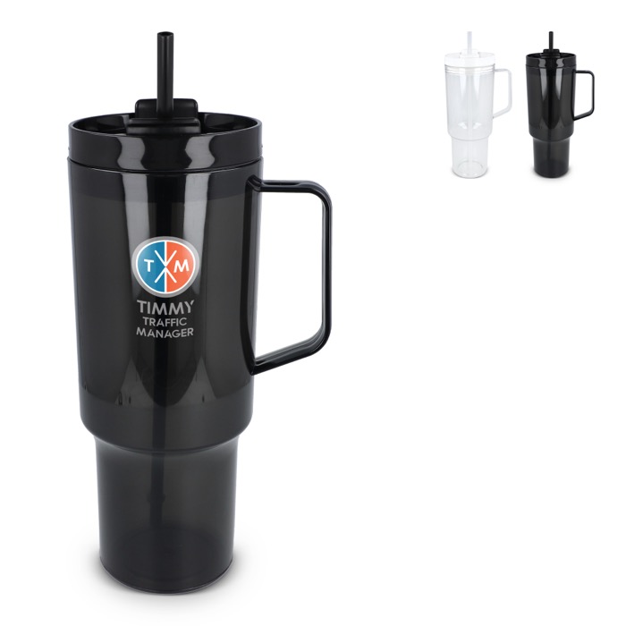 Thermobeker van gerecycled plastic met een modern ontwerp, bedoeld voor dagelijks gebruik op kantoor of onderweg. Met een handvat voor een fijne grip en een rietje om makkelijk te drinken tijdens meetings, in de auto of tijdens trainingen. De deksel met lekvrij systeem helpt morsen op tafel of in je rugzak te voorkomen, zodat je werkplek netter blijft. Oppervlak geschikt voor markering met logo en merkacties op bedrijfsevenementen.
