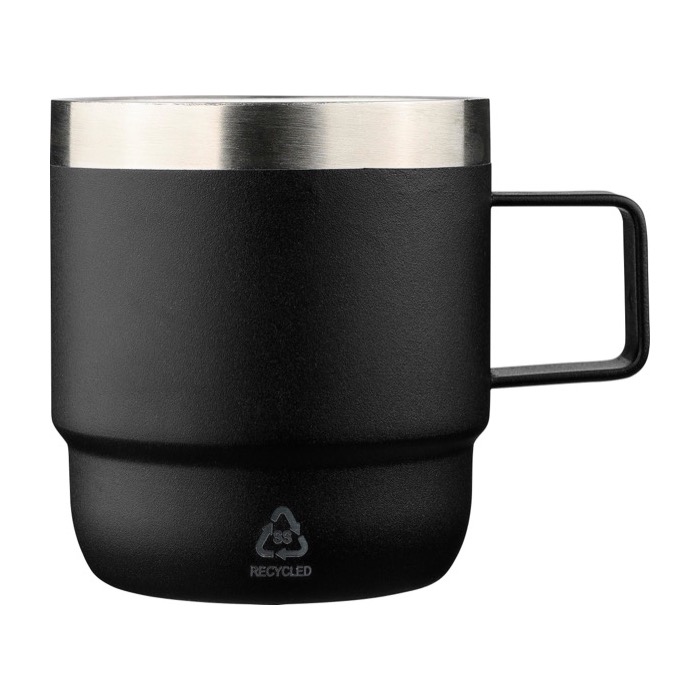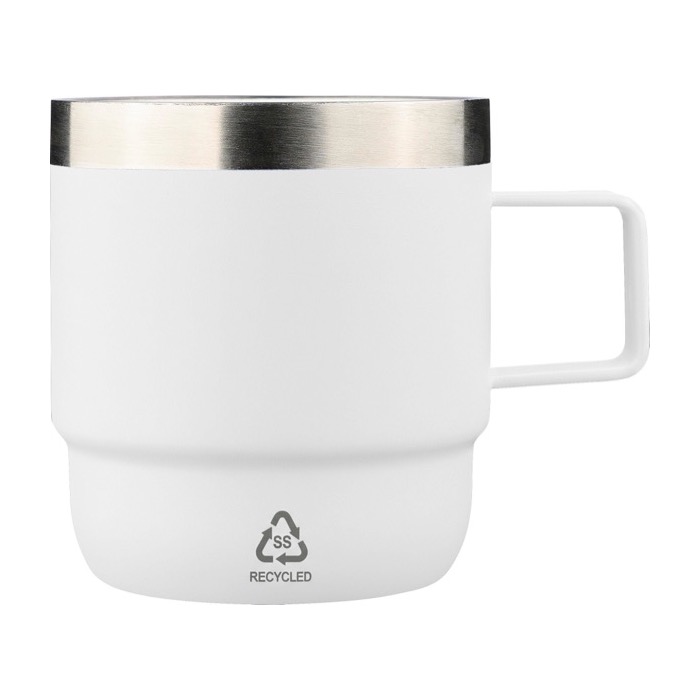 Roestvrijstalen mok met dubbelwand, bedoeld voor zakelijke omgevingen waar men een compact en consistent artikel zoekt. De binnenkant combineert roestvrij staal 304 met een keramische coating om de hygiëne te verbeteren en de overdracht van smaken en geuren te verminderen. De buitenkant is van roestvrij staal 201 en heeft een oor voor een comfortabele grip. Inclusief een roestvrijstalen logo dat aan de voorkant met laser is gegraveerd. Wordt geleverd in een individuele doos van bruin karton, handig voor welkomstacties of interne evenementen.