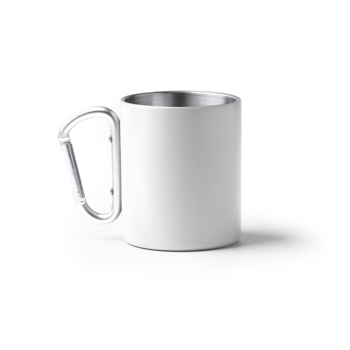 Dubbelwandige 304 roestvrijstalen mok met matte afwerking. Karabijnhaak van gerecycled aluminium. Inhoud van 300 ml. Presentatie in ecodoos.