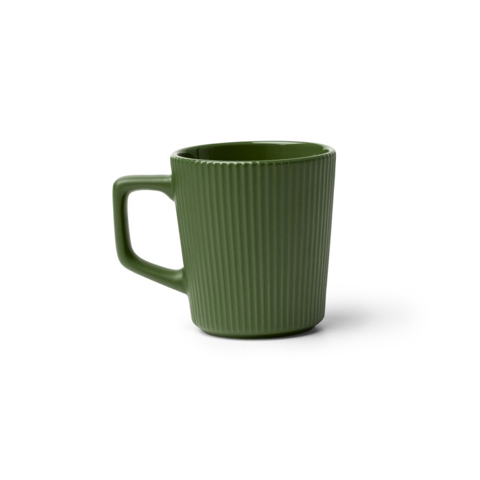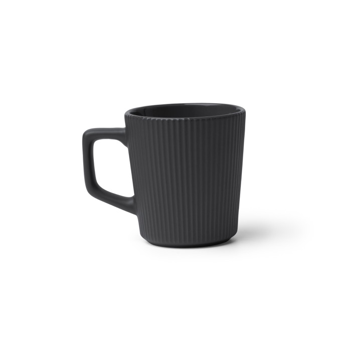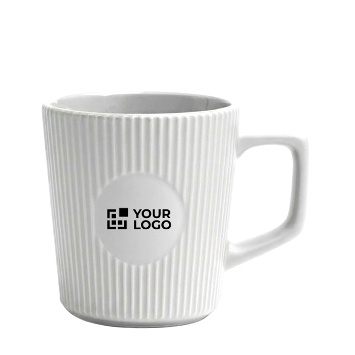 Keramische mok van 320 ml met matte afwerking aan de buitenkant en een binnenkant in bijpassende kleur. Het geribbelde oppervlak voelt uniek aan en geeft je dagelijks extra grip. Aan de voorkant zit een ronde zone die bedoeld is om de bedrukking gecentreerd en goed zichtbaar aan te brengen. Het geometrische oor geeft een ander detail, zonder het gebruik lastiger te maken. Een praktische keuze om je merk zichtbaarder te maken op kantoor, bij de receptie, tijdens trainingen of als relatiegeschenk.