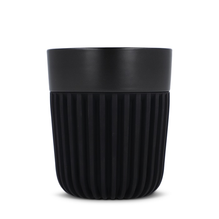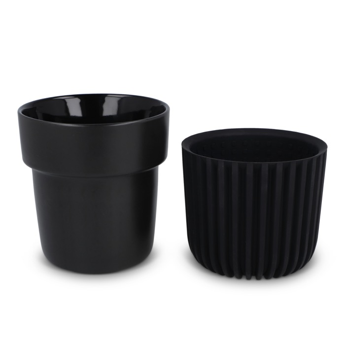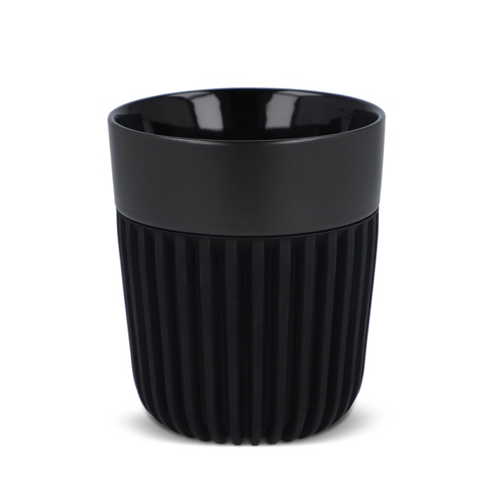 Nieuwe porseleinen mok met geribbelde siliconen hoes die helpt de warmte te isoleren en het oppervlak beschermt tegen stoten en schuren bij dagelijks gebruik. De zwarte afwerking geeft een rustige, nette uitstraling op tafel en op kantoor. Het formaat past in de meeste koffiemachines, zodat je sneller koffie kunt serveren. Geschikt voor de vaatwasser, dus onderhoud is simpel. Handige optie om te bedrukken met een logo en te gebruiken in vergaderruimtes, bij de receptie of voor interne acties.