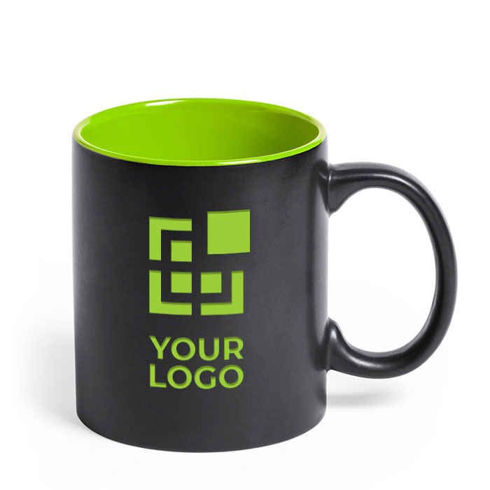 Keramische mok van 350 ml. Zwarte buitenkant, speciaal ontworpen voor laserprinten binnenkant in diverse kleuren. Bij het graveren van het logo aan de buitenkant, wordt de kleur van de binnenkant van de mok getoond. Gepresenteerd in een individuele doos.