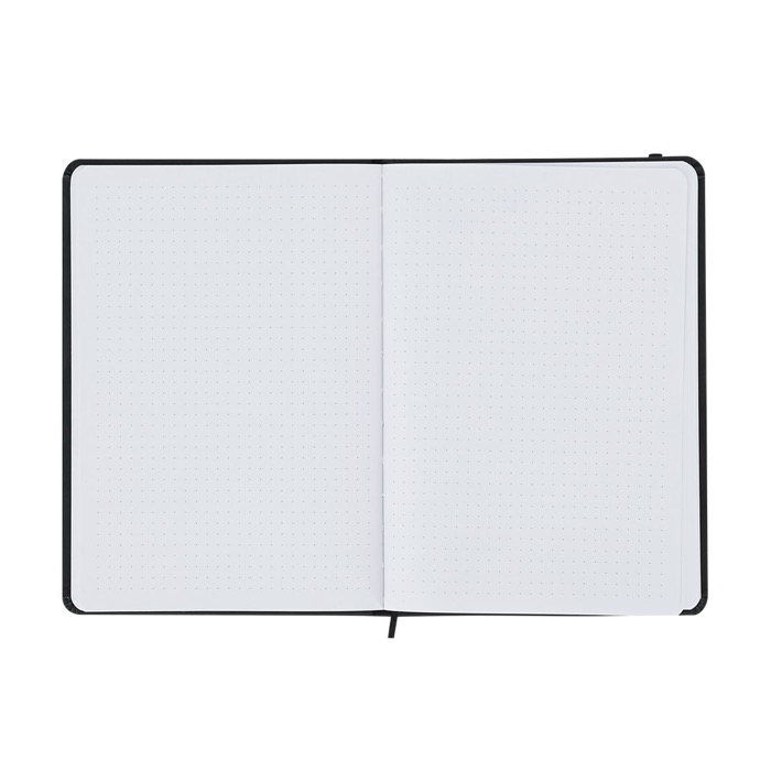 Notitieboek van kunstleer in A5-formaat, bedoeld voor dagelijks gebruik op kantoor en tijdens vergaderingen. Het heeft harde kaften die de inhoud beschermen en een stippenpatroon waarmee je ideeën, lijstjes en schema’s netter ordent. De elastische band houdt het stevig gesloten als je het meeneemt in een rugzak of aktetas, en het leeslint helpt je snel terug te gaan naar je werkpagina. Een praktische keuze voor interne communicatie, beurzen of zakelijke evenementen met branding.