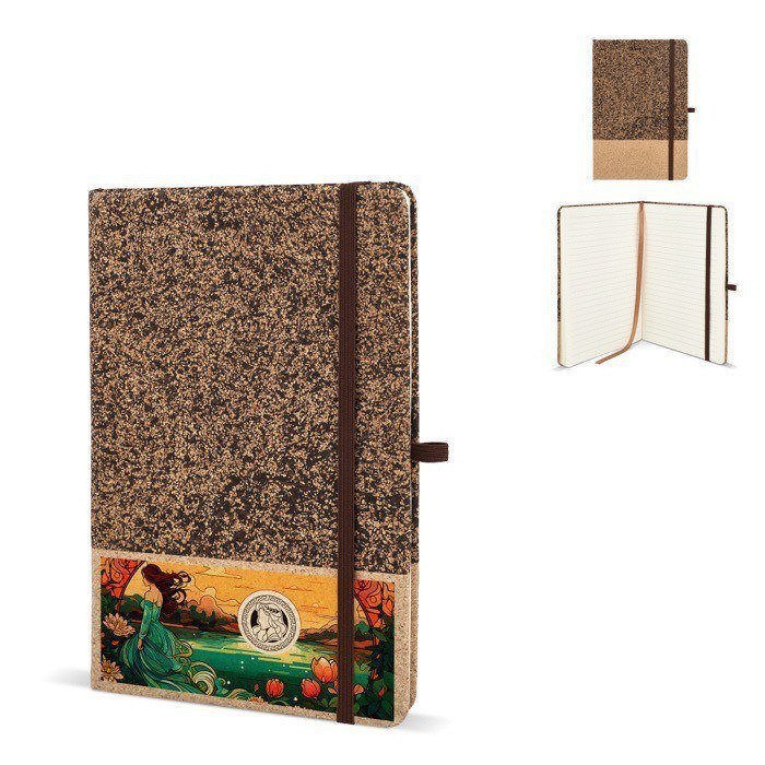 A5-notitieboek met een unieke kaft van kurk en koffiedik. Voorzien van een elastische sluiting, pennenlus en leeslint. Bevat 80 gelinieerde crèmekleurige pagina’s van FSC-gecertificeerd papier. Een natuurlijke en onderscheidende keuze.
