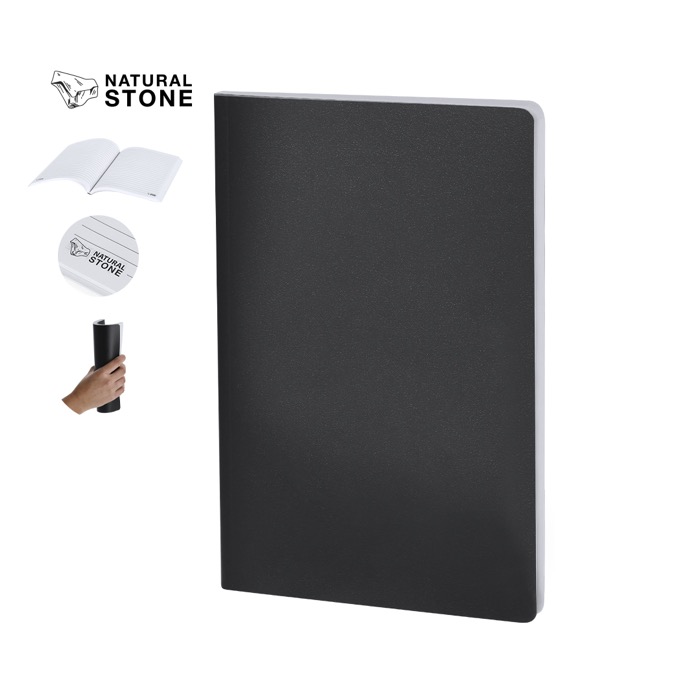 A5-notitieblok met zachte kartonnen kaften en witte pagina’s gemaakt van steenextracten. Bevat 64 gelinieerde vellen, bedoeld voor snelle notities, meetings of interne trainingen. De witte afwerking oogt strak en uniform. Op elk vel staat een Natural Stone-logo. Er zit ook een binnenblad bij dat het productieproces op basis van steenextracten uitlegt. Praktische optie voor congressen, onboarding en corporate communicatie.